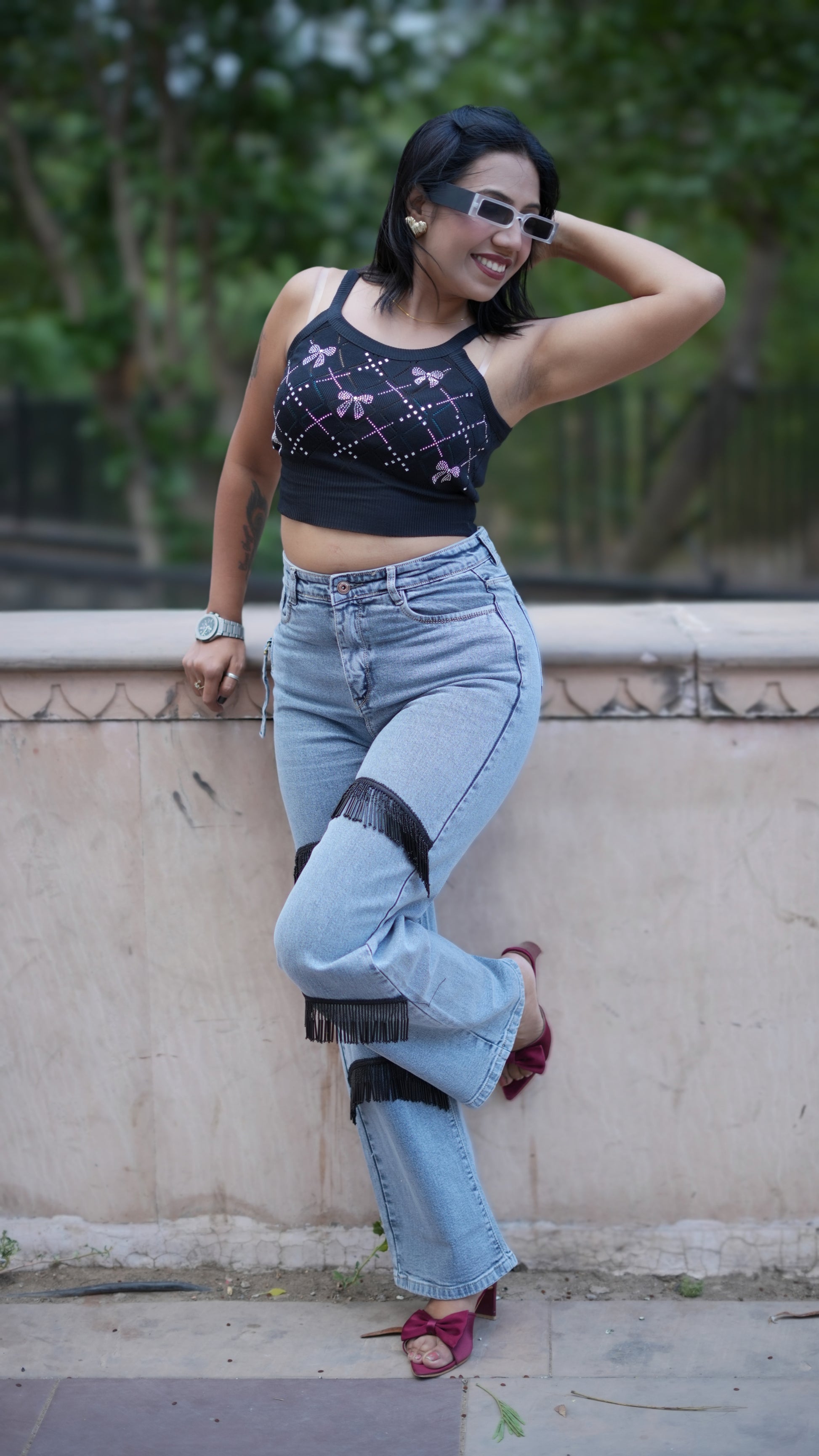 Elevate your style with our Fringe Panel Flare Jeans, made from soft stretch denim for maximum comfort and flexibility. The unique fringe panel design adds a touch of flair to these expertly crafted jeans. Perfect for any occasion, these jeans will give you the confidence to turn heads wherever you go.
